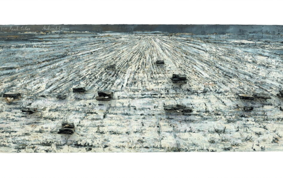 Für paul Celan : Aschenblume [pour paul Celan : fleur de cendre] 2006. Huile, émulsion acrylique, shellac et livres brûlés sur toile 330 x 760 x 40 cm. Collection particulière. Photo : © Charles Duprat
