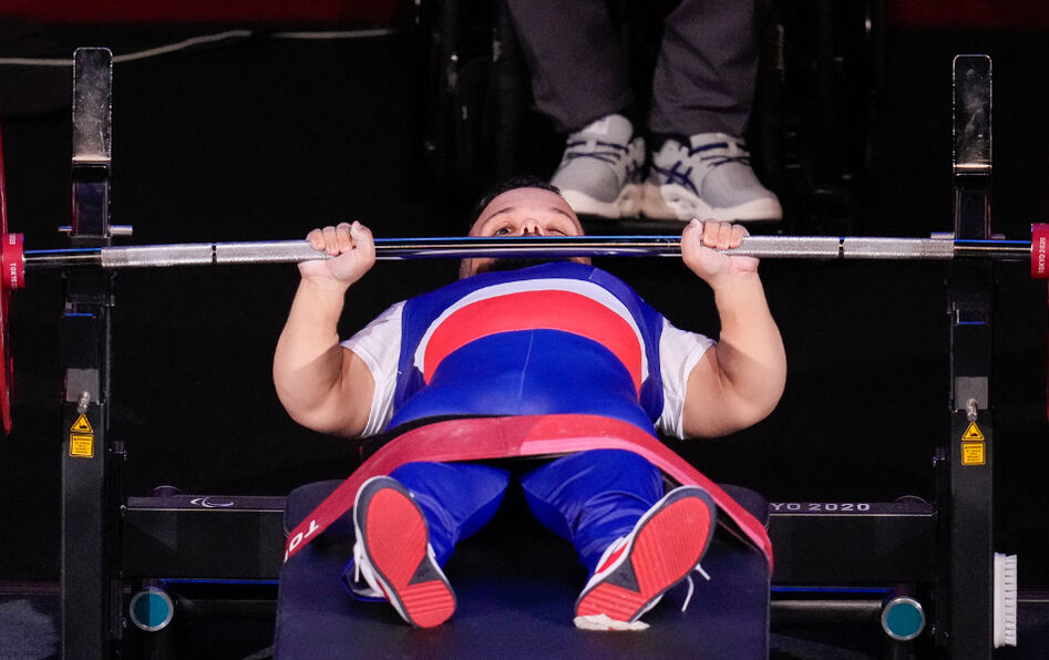 Jeux paralympiques de Tokyo, le 26 août 2021. Axel Bourlon (France) soulève 165 kilos au développé-couché lors de la finale d’haltérophilie, catégorie moins de 54 kilos. © Christopher Jue/Getty Images for International Paralympic Committee/AFP