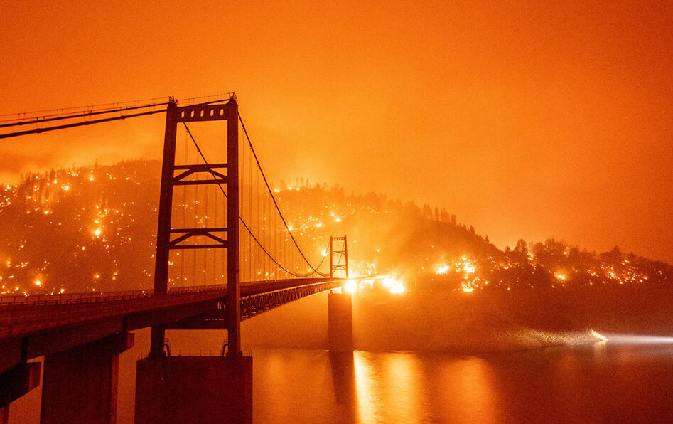 Entouré de flammes, un bateau passe devant le Bidwell Bar Bridge sur le lac Oroville, près de l'incendie d’Oroville en Californie, ce 9 septembre. © Josh Edelson/AFP