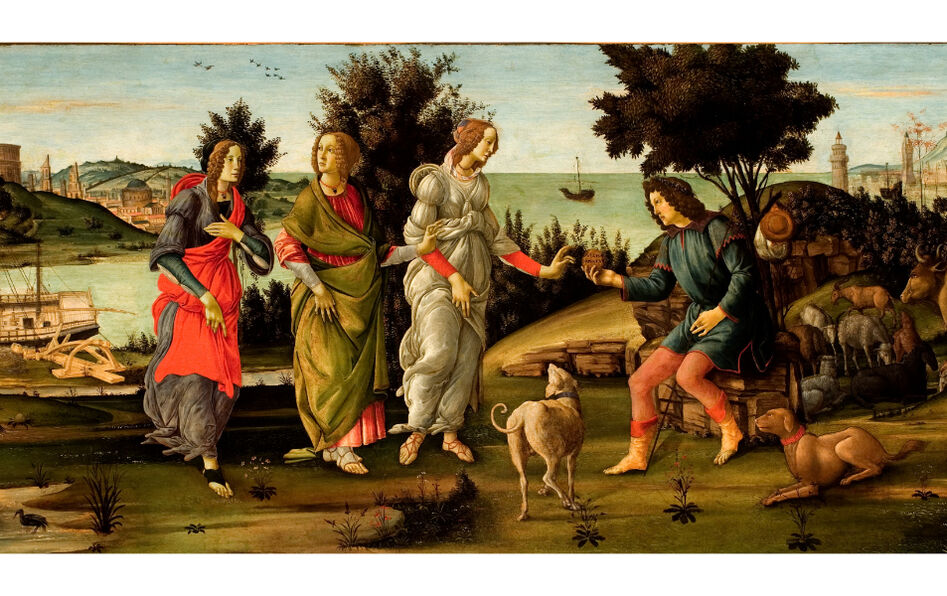 Alessandro Filipepi dit Botticelli (vers 1445-1510) et atelier, “Le Jugement de Pâris”, vers 1482-1485, tempera sur bois, 81 x 197 cm, Venise, Fondation Giorgio Cini, Galleria di Palazzo Cini, Venezia © Fondazione Giorgio Cini