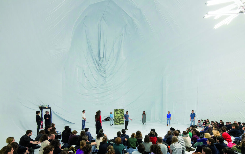 « Dans la période angoissante et catastrophique où nous vivons, nous ressentons le besoin urgent d’un théâtre que les événements ne dépassent pas, dont la résonance en nous soit profonde, domine l’instabilité des temps. » Antonin Artaud rédige cette note programmatique dans Le Théâtre et son double, un recueil d’essais paru en 1938. Ce texte est interprété au Théâtre Nanterre-Amandiers avec une actualité d’autant plus forte que le spectacle a été créé en mars, tout juste avant le confinement, avant que les théâtres ne ferment. Il est repris aujourd’hui, tandis qu’ils rouvrent. Dans cette adaptation périlleuse mais réussie, le metteur en scène Gwenaël Morin s’attache à raviver une certaine idée du théâtre qui ne soit pas seulement une distraction. Un théâtre qu’Artaud nomme, dans une formule devenue populaire, « de la cruauté », qui, « bousculant toutes nos représentations, nous insuffle le magnétisme ardent des images et agit finalement sur nous à l’instar d’une thérapeutique de l’âme dont le passage ne se laissera plus oublier ». Tout se passe sur le plateau, au plus près des comédiens, sous une chapelle de plastique blanc, à l’intérieur d’un ventre mou conçu par le scénographe Philippe Quesne. Les spectateurs sont assis sous cet échafaudage précaire, au sol, sans place attitrée. Le spectacle commence lorsqu’une reproduction gigantesque du livre d’Artaud est érigée face au public, tel le monolithe noir de 2001. L’odyssée de l’espace. Posé là comme une pierre de touche, il suscite un attrait curieux, rappelant le spectateur à cette question : comment réaliser un théâtre « qui nous réveille nerfs et cœur » ? La troupe s’y essaie avec humour, pariant à travers une série de saynètes potaches explorant la dimension performative de la parole – où dire, c’est véritablement faire. Après une heure de tentative, il n’est pas sûr que le spectacle aboutisse à la forme conventionnelle d’une représentation, mais il reste cette question excitante et non résolue, qui hante la littérature, la politique et la philosophie : comment avoir un discours neuf avec des mots anciens ?