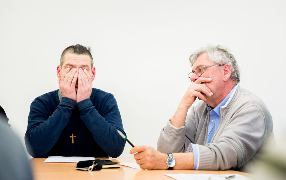 Séance de catéchèse avec Pierre, aumônier à la prison de Nantes (44) et quelques détenus, en 2017. © Thomas Louapre/Divergence