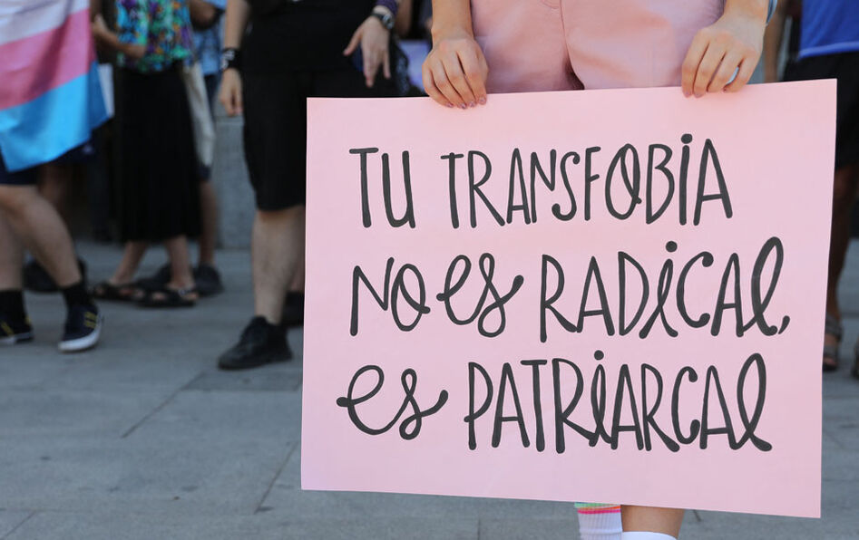 “Ta transphobie n’est pas radicale, elle est patriarcale.” Slogan des groupes transgenres lors d’une manifestation en réaction aux féministes qui s’opposent à l’adoption du projet de loi sur la reconnaissance légale de l’autodétermination sur le genre, le 26 juin 2021 à Madrid, en Espagne. © Isabel Infantes/Getty/AFP