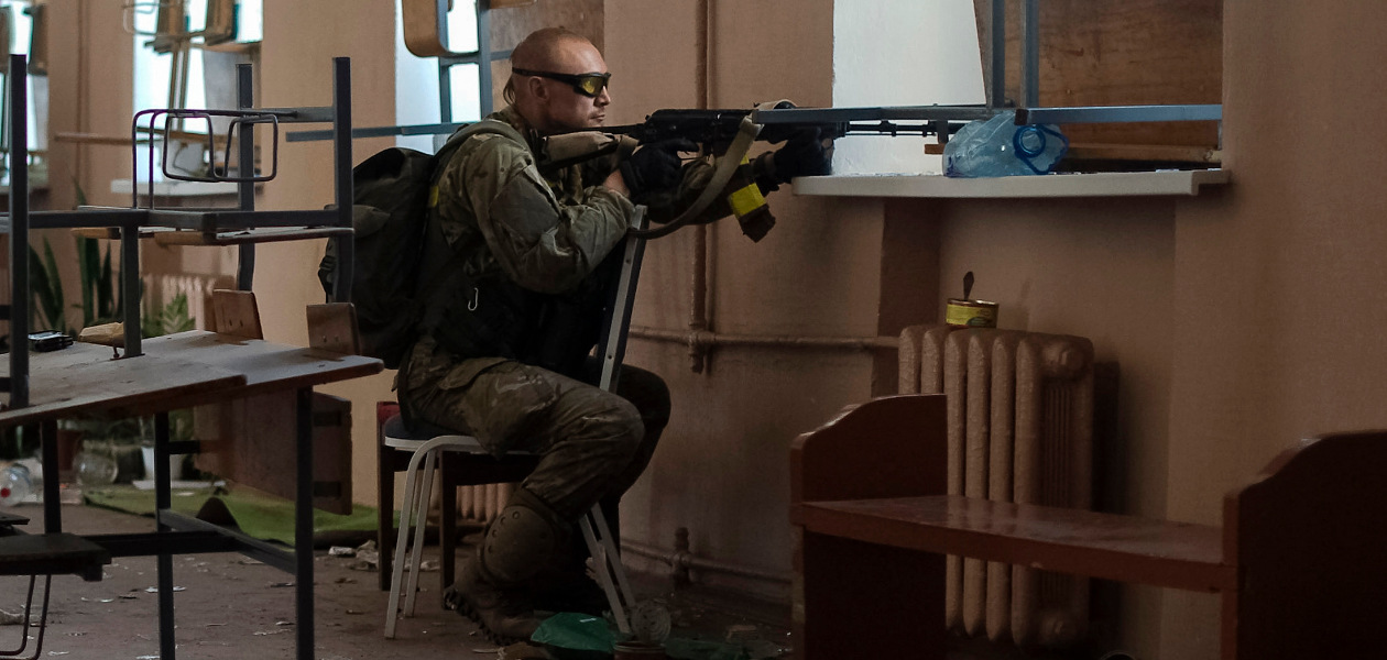 Ilovaïsk (Ukraine), le 26 août 2014. Un membre des forces de défense ukrainiennes en position lors d’un affrontement avec les séparatistes pro-Russes pendant le siège d’Ilovaïsk, à l’est du pays. © Maksim Levin/Reuters