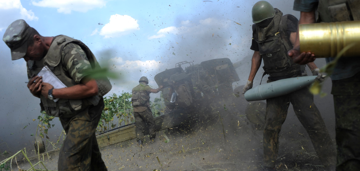 Pervomaïsk (Ukraine), le 2 août 2014. Des artilleurs de l’armée ukrainienne se protègent des déflagrations de leurs propres tirs, qu’ils effectuent en direction des séparatistes pro-Russes dans la région de Lougansk. © Maksim Levin/Reuters