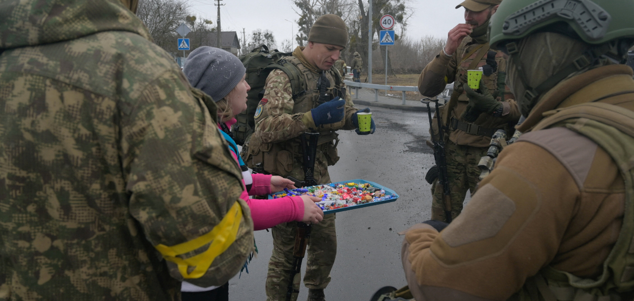 Yasnogorodka (Ukraine), le 2 mars 2022. En pleine invasion du pays par les forces russes, une femme propose des sucreries à des soldats ukrainiens dans un village près de Kiev.