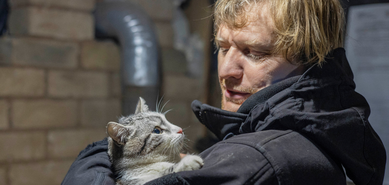 Région de Lougansk (Ukraine), le 6 janvier 2022. Maksim Levin avec un chat, près de la ligne de front opposant l’armée ukrainienne aux séparatistes pro-Russes. © Stanislav Kozliuk/Reuters