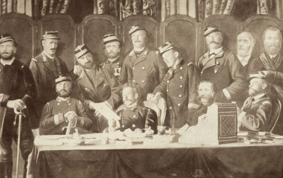 Photomontage de l’intérieur de l'Hôtel de Ville de Paris avec des membres de la Commune et des officiers supérieurs en délibération. © Photographe, Anonyme/Musée Carnavalet, Histoire de Paris - Domaine public