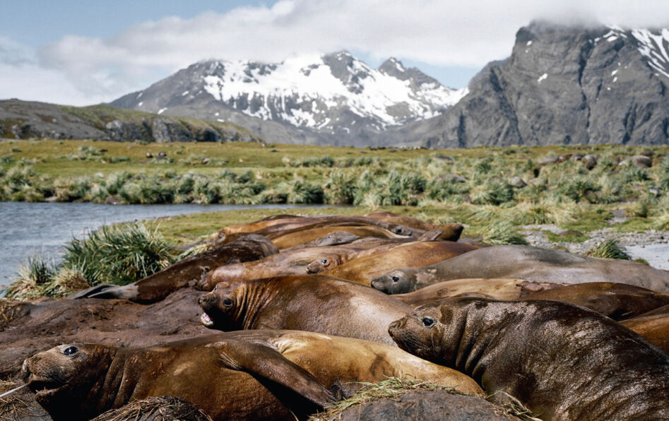 Éléphants de mer sur les rives des îles Sandwich, dans l’océan austral du Nord. Ce territoire fait partie de l’un des plus grands sanctuaires marins, au sein du programme Blue Belt mis en place par le gouvernement britannique. ©Florence Joubert/Pink /Saif images