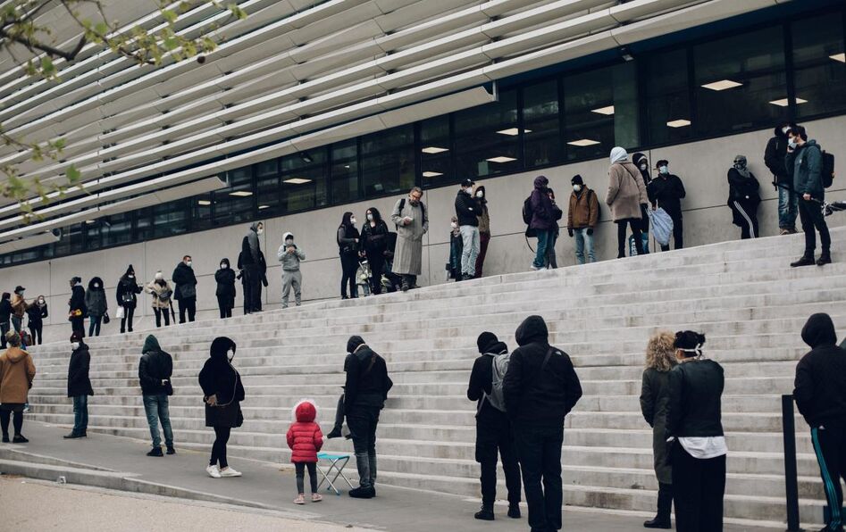 Le 24 mars 2020, à Marseille, des centaines de personnes font la queue devant l’Institut hospitalier de Mediterranée, dirigé par le Professeur Didier Raoult, afin de se faire dépister au Covid-19 et administrer, si besoin, le traitement à la chloroquine. © Théo Giacometti/Hans Lucas/AFP