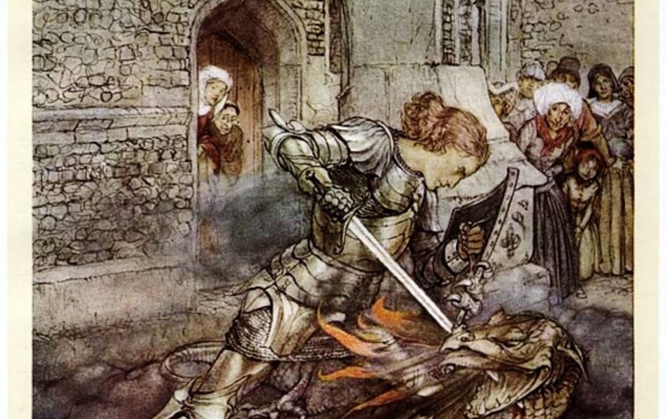 Lancelot slays the dragon, Arthur Rackam (cc) Wikimedia Commons / Gutenberg