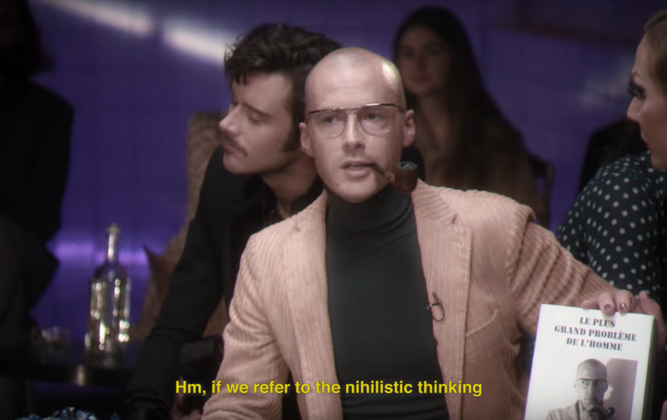 - Dans le clip Sacha Michel Zarev, entouré de journalistes, fait la promotion de son (faux) livre, Le Grand Problème de l’homme. Ce problème, selon lui, c’est « d’éprouver sans cesse un désir d'expansion » dans « un monde rempli de limites physiques et cartésiennes ». Il poursuit en expliquant que cette contradiction interne à l’homme se comprend « si l’on s’en réfère à la pensée nihiliste et aux philosophes tragiques », qui nous fait prendre la mesure de l’« insignifiance vertigineuse de notre existence ». Le penseur du nihilisme et du tragique ici cité est sans doute Nietzsche, qui fait de l’œuvre d’art l’expression de la pulsion vitale de l’homme (force dionysiaque) et des représentations qu’il produit (force apollinienne).