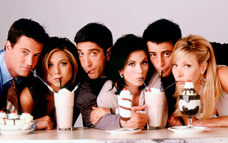 Le casting de la série Friends lors de la deuxième saison, diffusée entre 1995 et 1996 aux États-Unis. De gauche à droite : Matthew Perry (Chandler Bing), Jennifer Aniston (Rachel Green), David Schwimmer (Ross Geller), Courteney Cox (Monica Geller), Matt LeBlanc (Joey Tribbiani) et Lisa Kudrow (Phoebe Buffay). © Warner/Collection ChristopheL via AFP