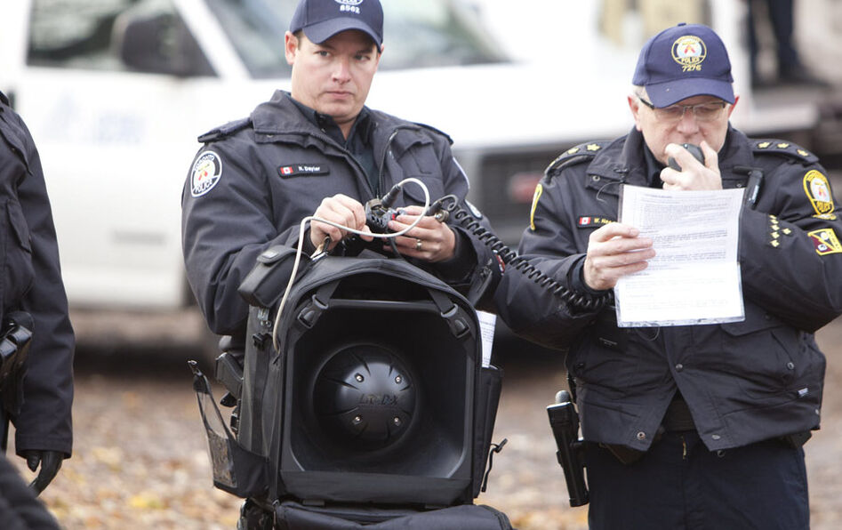 En 2011, à Toronto (Canada), un officier de police utilise un “outil acoustique à longue portée” (long range acoustical device, LRAD). © Chris Drost/ZUMA/REA
