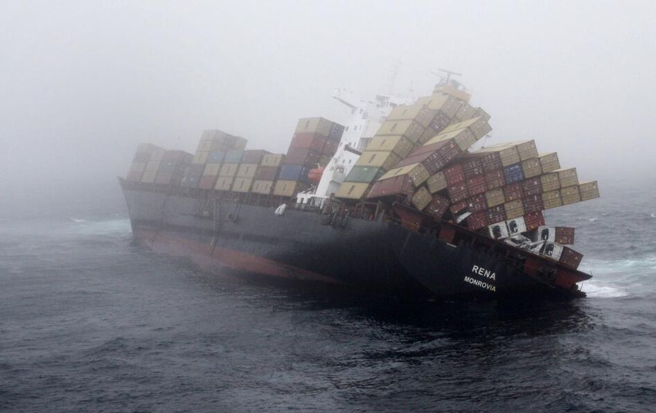 « Voici une photo du naufrage du porte-conteneurs MV Rena, qui a eu lieu le 5 octobre 2011 à une vingtaine de kilomètres du littoral et qui a causé une marée noire sur la Baie de l’Abondance, en Nouvelle-Zélande.