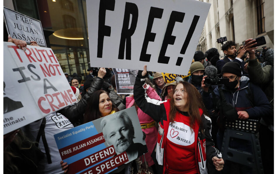 Londres, ce 4 janvier. Soulagés par la décision du Royaume-Uni de ne pas extrader Julian Assange vers les États-Unis, des soutiens du cybermilitant défilent devant l’Old Bailey, le bâtiment de la Haute Cour criminelle britannique. © AP Photo/Frank Augstein/Sipa
