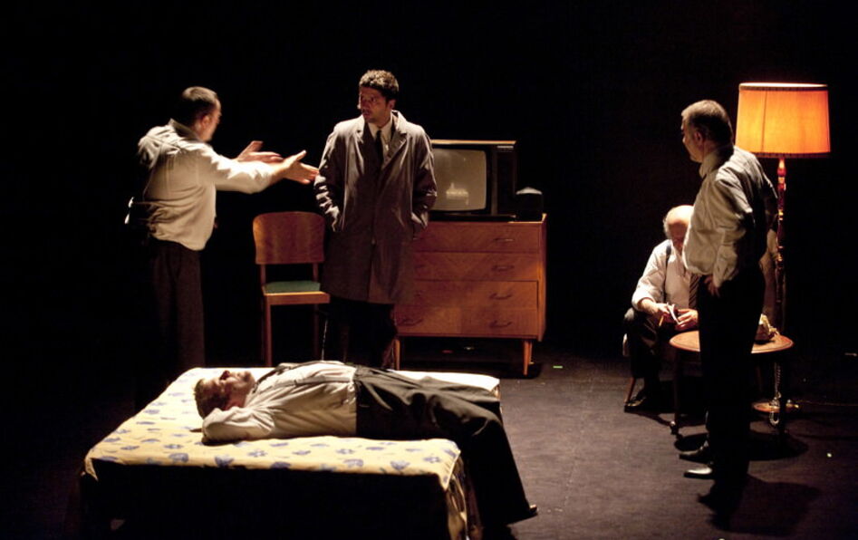 Nul besoin de grands artifices : cinq hommes sur un plateau quasi vierge, sans autres effets que le jeu. Un plateau ramassé entre quatre murs, dont celui fameux du théâtre, invisible : une chambre d’hôtel en guise de vitrine de l’évolution du monde. À huis-clos dans cette chambre pour représentants de commerce, toute l’histoire de la société défile par le petit bout de la lorgnette, depuis les Trente Glorieuses jusqu’à la grande « crise ».