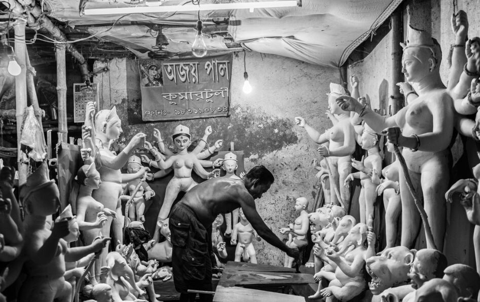 Ça commence dans les ruelles calmes de Kumartuli, ce quartier du nord de Calcutta où la déesse affleure lentement de l’argile et prend forme, sous la main experte du sculpteur d’idole. La minutie du geste – le même de père en fils –, la sûreté du regard (qui remarque à peine ma présence), le jeu d’ombre de l’atelier, où monstres et divinités sont plus nombreux et plus imposants que les hommes… Le présent s’efface au fil des allées sinueuses – je le quitte volontiers, soulagé d’excaver enfin cet autre temps, immémoriel et symbolique.