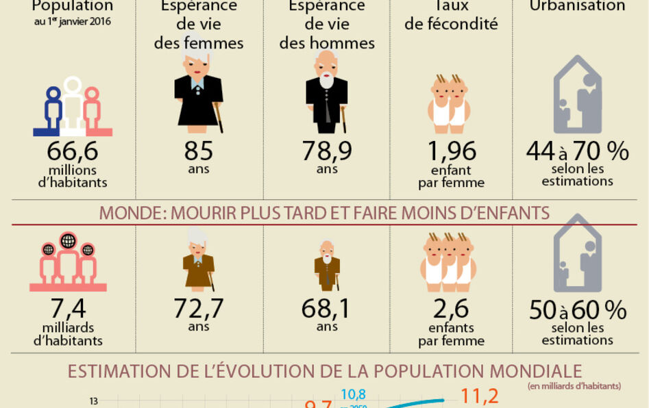 Selon le dernier bilan démographique 2015 de l’Insee, pour la première fois depuis l’après-guerre, l’espérance de vie des Français a décru, s’établissant à 85 ans pour les femmes (- 0,4 an) et à 78,9 ans pour les hommes (- 0,3 an). En cause : le nombre de décès : 600 000 (+ 41 000, soit + 7 %, par rapport à 2014), du fait d’une épidémie de grippe hivernale suivie d’un épisode caniculaire en été. Du côté du total des naissances, c’est aussi une décrue avec 800 000 naissances (- 19 000), faisant passer le taux de fécondité en dessous de 2 enfants par femme. Néanmoins, la population française continue d’augmenter (+ 0,4 %) grâce à un solde naturel (+ 200 000) et un solde migratoire (+ 47 000) qui restent positifs. Pour le moment, cette décroissance est donc conjoncturelle. Elle mérite cependant d’être rapprochée d’une autre surprise : la fin possible de l’urbanisation. Certes, trois quarts des Français vivent encore en ville, mais selon le démographe Gérard-François Dumont, le mouvement serait en passe de se stabiliser, voire de s’inverser, notamment à Paris, qui perd 50 000 habitants par an. « Tout se passe, écrit Dumont, comme si l’urbain était devenu globalement répulsif et le rural globalement attractif. »