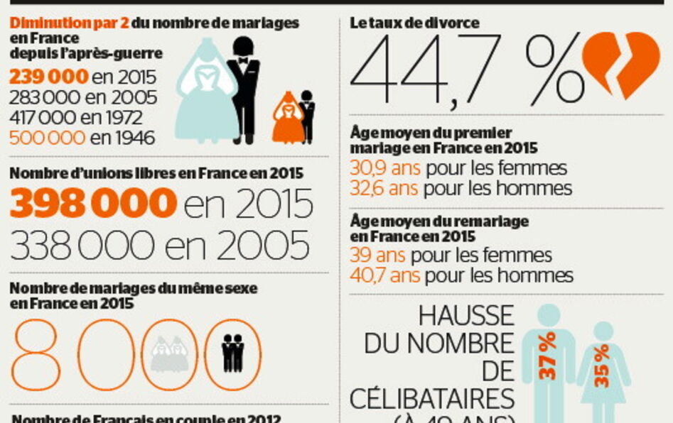 Jamais il n’y a eu aussi peu de mariages, jamais on ne s’est marié si tard, jamais on a autant divorcé… et jamais l’espace du couple, de la reproduction sexuée et de la famille n’a été aussi important pour les individus ! Tels sont les enseignements paradoxaux qui se dégagent des dernières études sur le mariage. Selon la plus récente, publiée par l’Insee, le nombre de mariages en 2015 s’établit à 239 000, soit moitié moins qu’en 1946. Mais le nombre des unions libres augmente, lui, symétriquement, passant de 338 000 en 2005 à 398 000 en 2015. Une tendance que l’on observe dans toute l’Europe et aux États-Unis. Seul un homme et une femme sur deux se marieront dans les générations à venir. Deux ans à peine après la promulgation du mariage pour tous, même les mariages entre personnes de même sexe diminuent, passant de 10 500 en 2014 à 8 000 en 2015. Tandis que l’âge moyen du mariage (autour de 30 ans contre 20 ans dans les années 1930) recule, le taux de divorce se stabilise (autour de 44 %), et le taux des naissances hors mariage explose (près de 60 %).