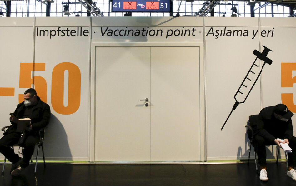 Berlin, le 27 décembre 2020 : deux hommes attendent d’être vaccinés contre le Covid-19 au centre de vaccination Arena Berlin. © Markus Schreiber/DPA via ZUMA/Réa