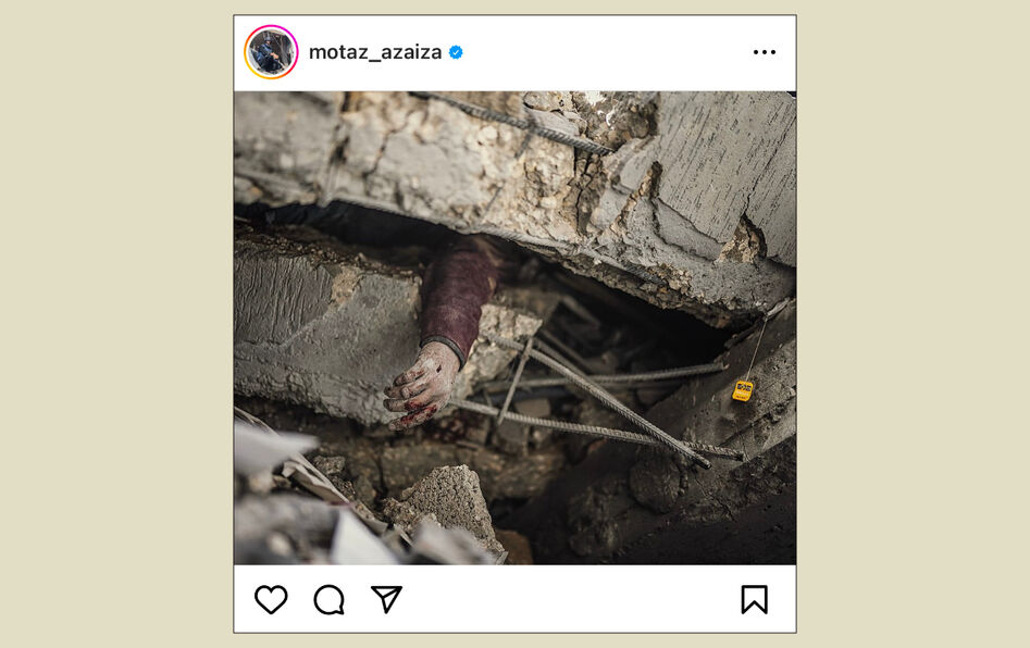 « Parmi toutes les photos et vidéos qui nous parviennent de Gaza et de l’horreur qui s’y enlise jour après jour depuis deux mois, une image a recueilli plus d’un million de likes sur la plateforme Instagram. Elle est signée du jeune photographe et reporter gazaoui Motaz Azaiza, choisi par GQ Middle East comme “homme de l’année 2023” fin novembre. Sur cette photo postée lundi, on voit le bras d’un homme écrasé entre deux dalles de béton éboulées. Vu la configuration des gravats, il y a peu de chances que l’homme soit encore en vie. À quelques centimètres de sa main couverte de poussière, pendouille un sachet de thé qui aura sans doute eu à peine le temps d’infuser.