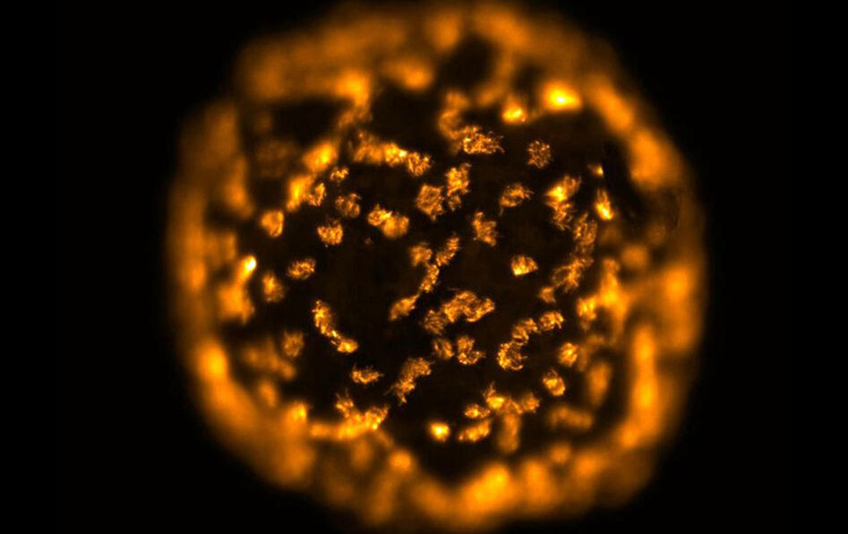 Chaque cellule évolue en une sphère couverte de cils cellulaires. Ces milliers de petites excroissances en touffes (ici en orange) jouent le rôle de rames, qui permettent à la cellule de se mouvoir dans un environnement aqueux. © Doug Blackiston, Tufts University