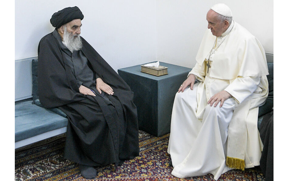 • Puissance du dénuement. Si la photo de la rencontre entre le Pape et le marja (مرجع, « source d’imitation » en arabe, le plus haut degré du clergé chiite) frappe à ce point, ce n’est pas seulement parce que c’est la première entrevue entre le chef du catholicisme et l’un des grands guides du chiisme. Ces deux hommes, à la tête de centaines de millions de croyants, mettent en scène leur aura spirituelle. Mis à part le tapis, rappelant l’origine iranienne d’al-Sistani, tout est sobre, pauvre, dépouillé. D’ordinaire, al-Sistani n’apparaît d’ailleurs jamais en public. Face aux grands chefs d’État qui aiment à exhiber leurs palais et leur magnificence, les deux leaders spirituels marquent leur supériorité par le dénuement.