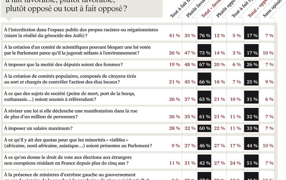 Or, c’est précisément cette évidence qui est en train de se fissurer, de prendre l’eau. Cela fait un moment déjà qu’on entend parler de « crise de la représentation » : loin de se comporter en représentants de la volonté du peuple, nos politiciens ont tendance à former une caste dirigeante fermée, composée de professionnels du marketing idéologique, proches des puissances de l’argent, complices entre eux, oublieux des intérêts communs. Mais cette crise de la représentation est souvent décrite dans des termes abstraits. Voici donc des éléments de réflexion plus concrets : le sondage réalisé par TNS-Sofres pour Philosophie magazine constitue une photographie pour le moins sidérante de la crise de la représentation. Jugez plutôt : 49 % des Français considèrent que la démocratie a reculé en France depuis l’an 2000, quand 14 % d’entre eux seulement estiment qu’elle a progressé. Ce sentiment partagé d’une trahison des principes démocratiques s’explique certainement par des facteurs liés à la conjoncture : la cote de popularité du Président Sarkozy est au plus bas ; l’affaire Woerth a indigné les Français, avant que les soupçons de corruption de la République ne soient aussitôt relancés par l’affaire Karachi ; la circulaire sur les Roms, les écoutes de journalistes, l’effacement de la fonction du Premier ministre s’apparentent à des faits du prince ; le passage en force de la réforme des retraites a parachevé cette impression d’indifférence du gouvernement à l’opinion publique. Cependant, le mécontentement n’est pas le seul apanage de la gauche : un électeur de l’UMP sur trois estime que la démocratie est en recul sur la décennie écoulée, un sur deux pense qu’elle a stagné… C’est là le signe d’un malaise dépassant les clivages traditionnels et les effets de conjoncture : il exprime une lassitude profonde vis-à-vis du principe même de la représentation. Le citoyen ne se reconnaît plus dans le jeu de rivalité mimétique des partis, et encore moins dans l’action des hommes politiques ; il s’estime dépossédé de la voix qu’il exprime en glissant son bulletin dans l’urne. Sur les questions importantes – l’euro et l’Union européenne, la gestion de la crise économique depuis 2008, la réforme de la fiscalité, la politique énergétique et écologique –, la majorité des électeurs ne se sent pas prise en compte.