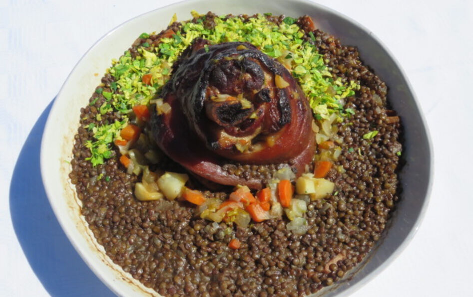 1 kg de petit salé (échine, travers, éventuellement palette), 2 carottes, 2 gros oignons, 600 g de lentilles vertes, 1 bouquet garni, poivre