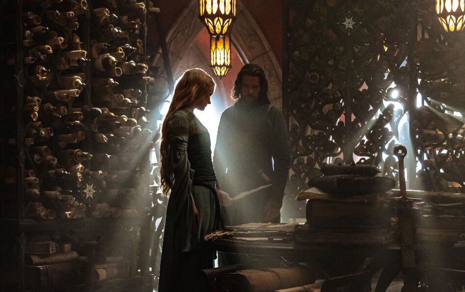 Galadriel(Morfydd Clark) et Elendil (Lloyd Owen) dans la série “Le Seigneur des anneaux. Les Anneaux de pouvoir” (2022). © Matt Grace/Prime Video