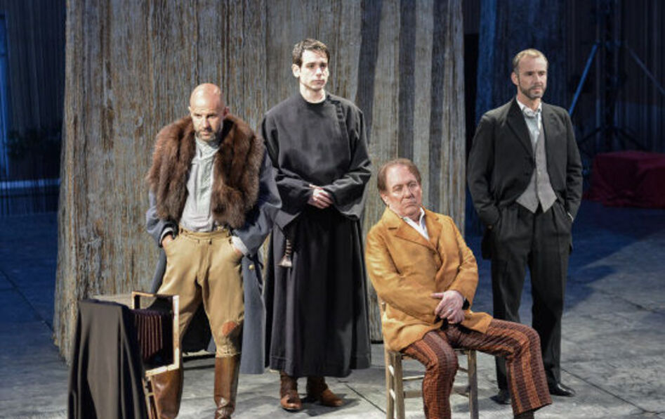 Pour réaliser le tour de force d’accommoder pour la scène ce roman-fleuve aux mille intrigues entrecroisées, il a fallu pas moins de quatre mains expertes : Sophie-Iris Aguettant, Cécile Maudet, Olivier Fenoy, et Bastien Ossart. Le spectacle leur doit sa cohérence. Le sacrifice de certaines digressions s’est avéré nécessaire, dont le célèbre passage du Grand Inquisiteur qui, il est vrai, fournirait à lui tout seul la matière d’une pièce.