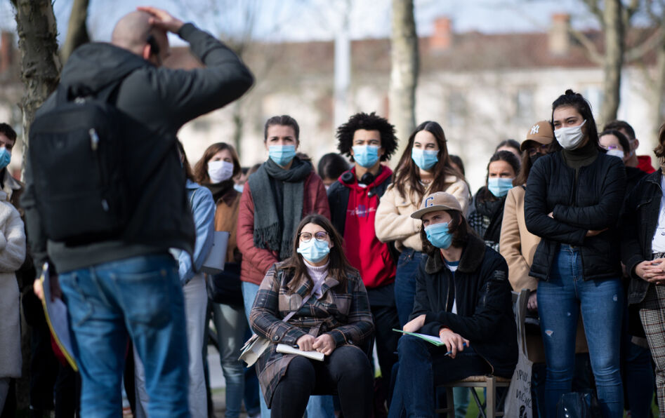 Le 15 décembre 2020, le chercheur en sciences de l’information et de la communication Olivier Ertzscheid prend la parole dans un parc public de la Roche-sur-Yon pour sensibiliser à la “profonde détresse psychologique des étudiants”. © Loïc Venance/AFP