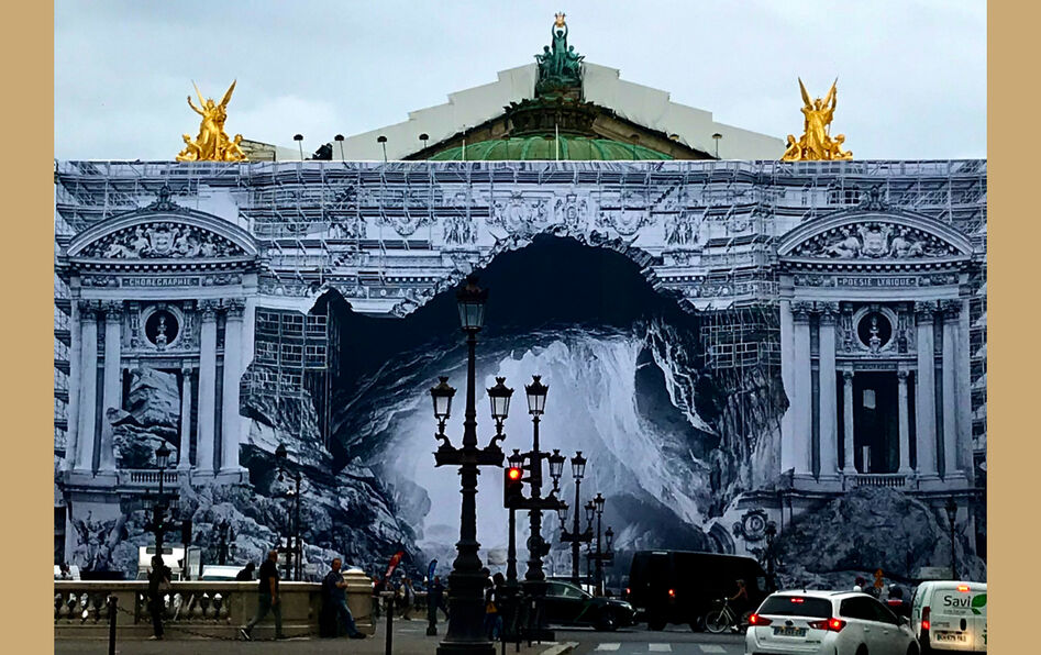 Retour à la caverne – Acte 1. C’est sur ces quelques mots que s’ouvre la dernière installation du photographe Jean René, dit JR. Habilleur des grands monuments, du palais d’Iéna à la pyramide du Louvre en passant par l’esplanade du Trocadéro, cette personnalité médiatique du monde artistique est connue pour des collages photographiques grandeur nature. Son dévolu se jette à présent sur l’Opéra Garnier dont il recouvre les échafaudages d’un immense trompe-l’œil en noir et blanc.