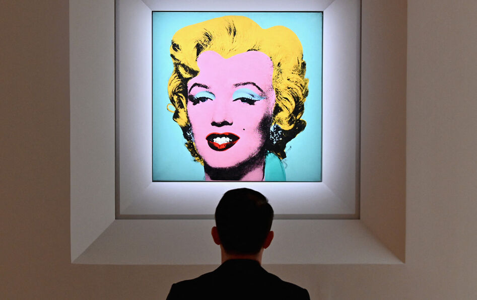 Salle de vente aux enchères de la société Christie’s, à New York (États-Unis), le 29 avril 2022, où l’œuvre “Shot Sage Blue Marilyn” (1964) d’Andy Warhol était exposée avant sa mise en vente le 9 mai.Elle a été acquise après quatre minutes d’enchères par le marchand d’art Larry Gagosian, pour la somme record de 195 millions de dollars. © Angela Weiss/AFP