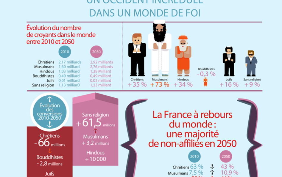 Dans cette diversification des croyances, l’Europe, et la France en particulier, font exception : dans l’Hexagone, les non-affiliés devraient voir leur poids doubler (passant de 28 % à 44 %) pour devenir le groupe majoritaire, devant les chrétiens (43 %). Mouvement également sensible aux États-Unis où les chrétiens qui représentaient les trois quarts de la population ne seront plus que deux tiers. C’est sur le continent africain que le christianisme gagne les esprits : 38 % des chrétiens vivront en Afrique subsaharienne en 2050 contre 16 % en Europe. Pour mesurer le changement, il faut rappeler qu’il y a un siècle, en 1910, 66 % des chrétiens du monde étaient en Europe. L’Asie, elle, suit des chemins contrastés : alors qu’à Hong Kong et au Japon, on devrait voir l’incroyance atteindre des niveaux inégalés de près de 60 %, la Chine pourrait voir le nombre de chrétiens exploser, alors que celui des bouddhistes resterait le même (20 %). Chiffre intéressant dans ce mouvement des esprits : les flux de conversions. Le christianisme connaîtra une diminution de 66 millions de croyants (106 millions de sortants pour 40 millions d’entrants). Chose étonnante, le bouddhisme, qui est l’objet d’un intérêt grandissant en Occident, perdrait 3 millions de fidèles, tandis que l’islam compterait 3 millions de convertis. L’enseignement général de cette étude est clair : l’Occident ne donne plus son rythme à la croyance mondiale. Alors que l’incroyance progresse en Europe, en Amérique et à la pointe de l’Asie, partout ailleurs, les religions, dans leur multiplicité, se révèlent beaucoup plus « résilientes » que ce qu’on avait prévu, comme le concluent les auteurs de l’étude.
