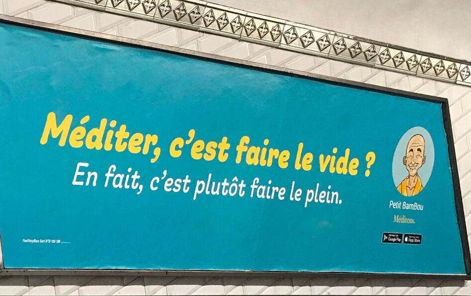 Adepte de la méditation ? Vous avez peut-être téléchargé Petit Bambou, l’application de méditation la plus en vogue du moment. Elle propose des exercices de méditation pour faire face à une myriade de situations, du stress au deuil en passant par la vie au travail. Une nouvelle campagne d’affichage en vante les mérites : « Faire le vide » par la méditation permettrait de « faire le plein » dans sa vie.
