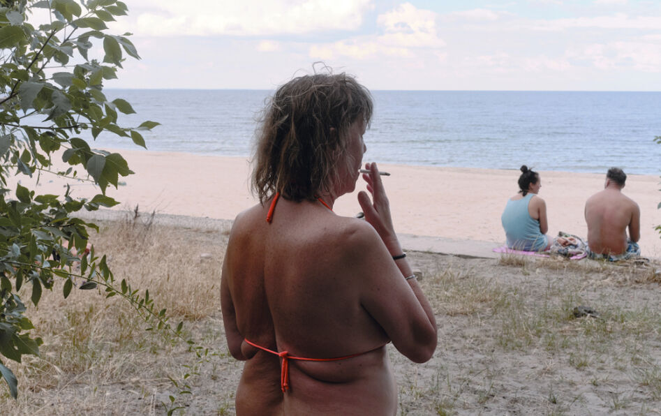 L’Ukraine ne possède pas de navires de guerre, tandis que la flotte militaire russe est là, tout près. Elle se montre parfois, pour faire peur. Hier, à quelques kilomètres d’ici, un homme a sauté sur une mine devant son fils et sa femme alors qu’il entrait dans l’eau – il s’agissait d’une mine russe, apparemment, qui avait dérivé vers le bord. Ici, tout le monde en parle. Malgré tout, on étale sa serviette sur des plaques de métal ou des planches de bois, en surplomb des étendues de sable.