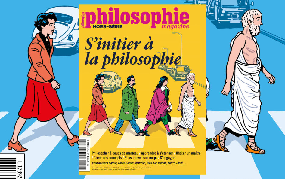 « Autant abattre mes cartes, c’est moi, c’est l’Italien, le VRP de la philosophie, est-ce qu’il y a quelqu’un, est-ce qu’il y a quelqu’une ? Si oui, frappez deux coups chez votre kiosquier pour y découvrir notre numéro spécial consacré à l’initiation à la philosophie. Il est jaune, il est beau, et les Beatles de la philo sont en couverture, façon Abbey Road. Here Comes the Sun!