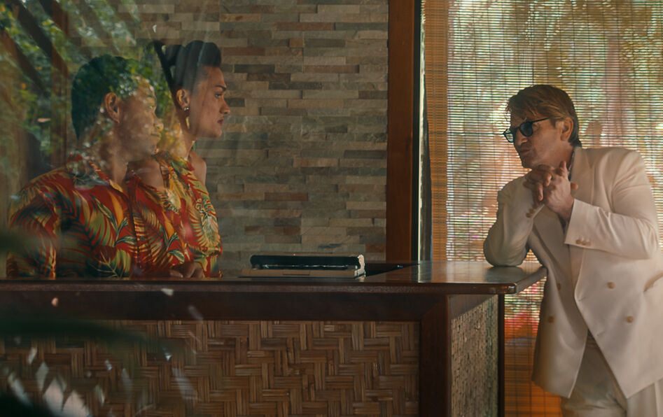 Dans le crépusculaire Pacifiction, Benoît Magimel incarne un officiel métropolitain confronté à des rumeurs de reprises d’essais nucléaires à Tahiti, projet hypothétique qui agite la communauté locale. Vêtu d’un parfait costume écru de colon avec chemise à fleurs, mais sincèrement attaché aux habitants de l’île et opposé à ces essais après le traumatisme de 1996, De Roller mène l’enquête tout en jouant aux représentants de l’État. Sa parole a une double fonction : convaincre son auditoire de lui livrer des informations confidentielles et assurer la continuité symbolique de la présence française à travers diverses adresses publiques.