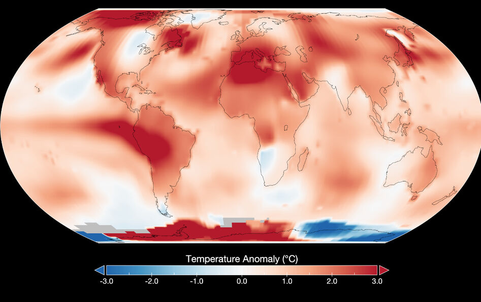Cette carte des températures mondiales en juillet 2023 montre les écarts de chaleur sur l’ensemble du globe par rapport à la normale saisonnière entre 1951 et 1980. En rouge, les zones qui présentaient une température plus haute que la moyenne pour un mois de juillet. En bleu, les températures inférieures. © NASA’s Goddard Institute for Space Studies