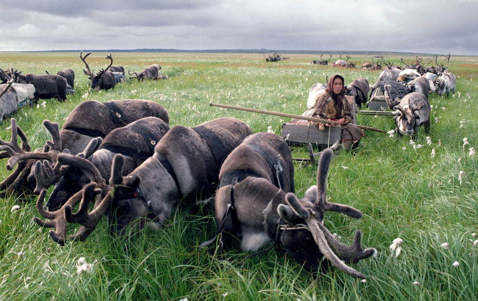 Valla Serotetto, une femme nenet, se repose et laisse paître ses rennes, toujours attachés au traîneau. Péninsule de Yamal, Sibérie (Russie). © Briand et Cherry Alexander/Cosmos