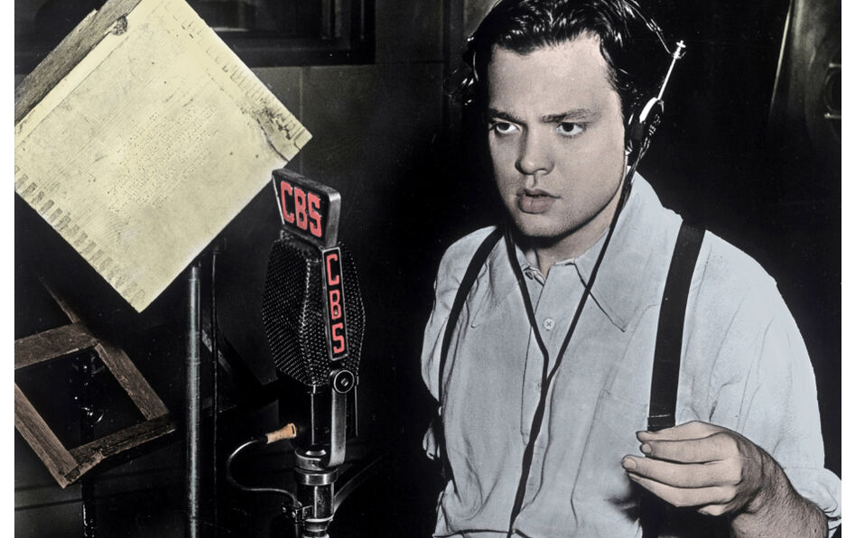 Orson Welles (1915-1985) pendant l'émission “La Guerre des mondes” (“The War of the Worlds”) de l’Anglais H.G. Wells, adaptée pour la radio le 30 octobre 1938. © Costa/Leemage via AFP