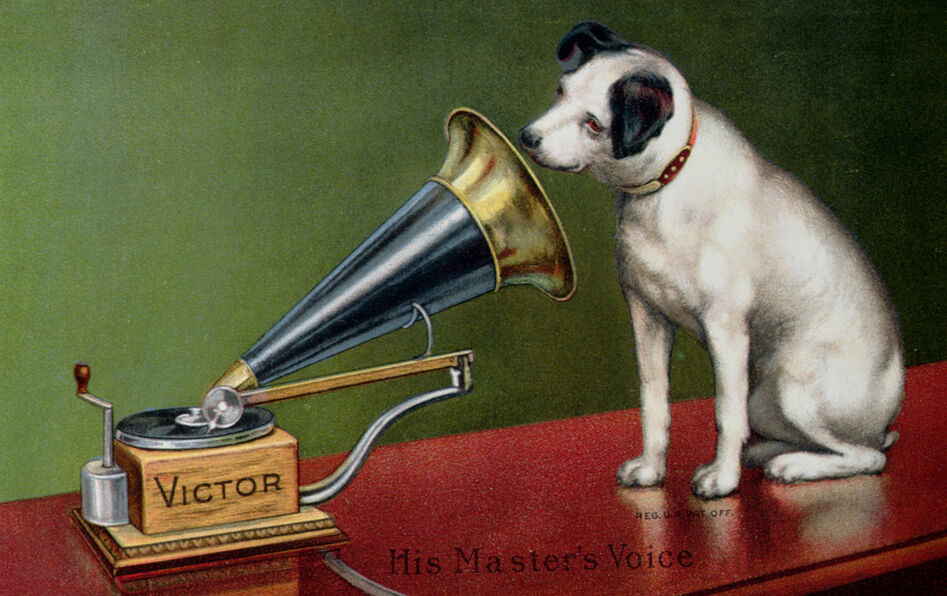 Réclame pour les phonographes Victor, vers 1910, d’après Francis Barraud et la publicité de Pathé “La Voix de son Maître”. Moult fois déclinée par diverses majors du disques tout au long du XXe siècle, la peinture originale de Barraud, “His Master’s Voice”, deviendra l’un des plus célèbres logotypes de l’industrie musicale. © Archives Charmet/Bridgeman