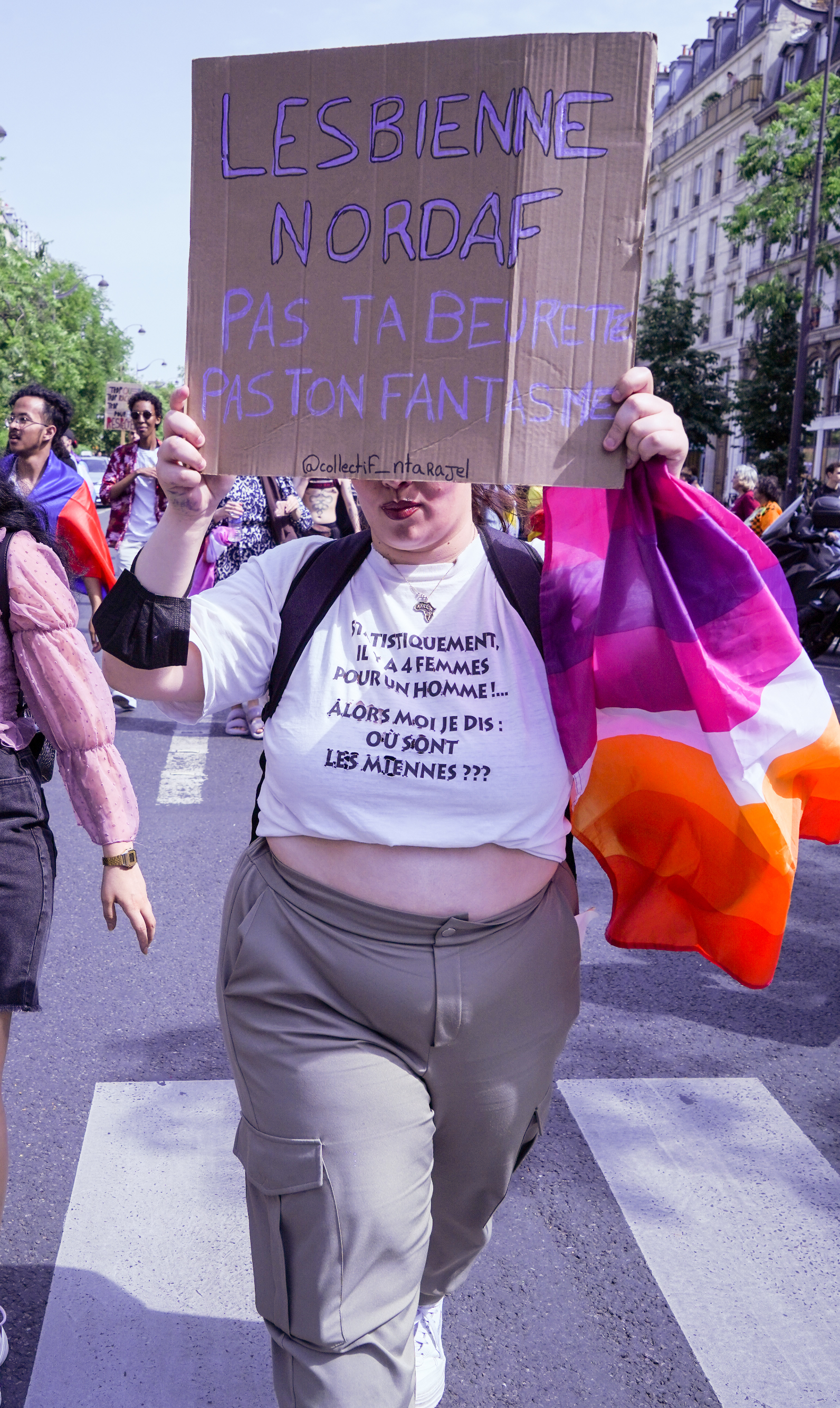 Pour l’immense majorité, les participants à cette « Pride radicale » n’ont pas 30 ans. Si beaucoup revêtent le drapeau arc-en-ciel ou en ont tagué les couleurs sur leur corps, nombre d’entre eux affichent d’autres couleurs : celles de la trans-identité (bleu, rose et blanc), de la pansexualité (bleu, jaune et rouge) ou de la bisexualité (rouge, violet et bleu marine). On voit aussi passer des drapeaux nationaux, ceux de l’Algérie et de la Palestine notamment, avec des slogans comme « Lesbienne nordaf [nord-africaine] : pas ta beurette, pas ton fantasme ». Côté « traditions », les joues et les fesses affichent force paillettes.