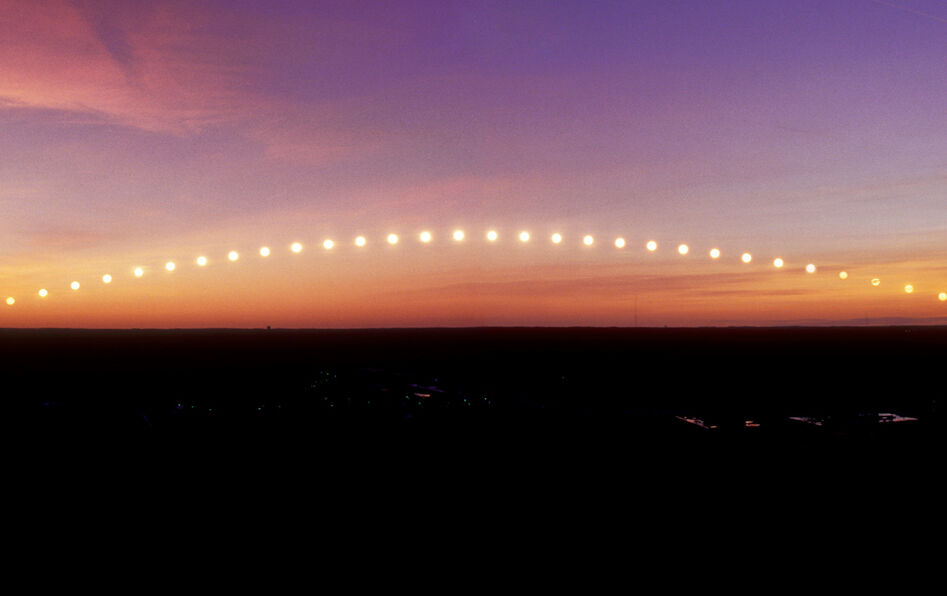 La course du soleil pendant le solstice d’hiver au 60e parallèle nord. Montage séquentiel réalisé à partir de photos prises lors de la journée la plus courte de l’année, en décembre 2007 à Turku (Finlande). © Pekka Parviainen/SPL/sciencephoto.fr