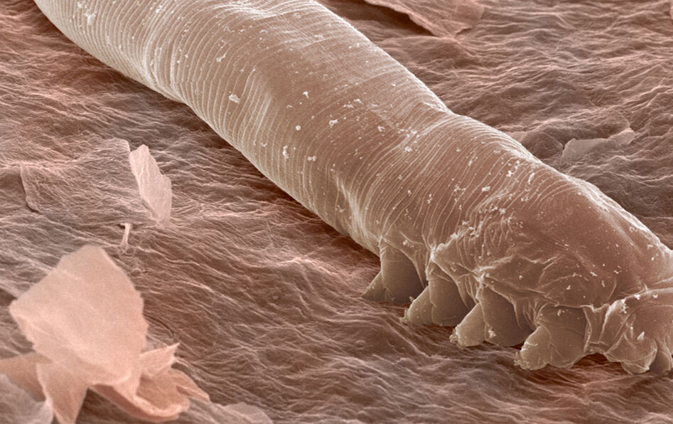 Le Demodex folliculorum, arachnide microscopique qui vit à la surface de notre peau, est-il en train de fusionner avec le corps humain ? Si le terme de fusion peut sembler prématuré, le séquençage récent de leur génome laisse peu de place au doute : « Ils ont moins de gènes que les autres espèces d’acariens. Ils fonctionnent avec moins de protéines – leur répertoire de protéines est le nombre le plus réduit jamais vu chez ce type d’espèces. » Logés dans nos pores, les acariens y trouvent tout ce qu’il leur faut : nourriture, abri, etc. Cette situation confortable – sans menace et sans compétition – les a conduits à abandonner certaines fonctions physiologiques. Ils ne se déplacent plus vraiment, et vivent comme enracinés en nous. Un exemple frappant de certains concepts de la biologie contemporaine : niche, co-évolution, sélection, etc. Éclairage.