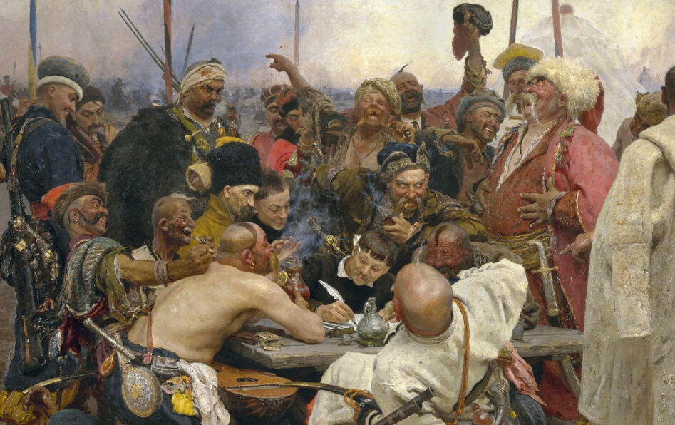 Ilia Répine (1844-1930), “Les Cosaques zaporogues écrivant une lettre au sultan de Turquie”, 1880-91, huile sur toile, 2,03 × 3,58 m, conservé au musée Russe de Saint-Pétersbourg (Russie). Les Cosaques hilares rédigent un courrier d'insultes au sultan de l’Empire ottoman, Mehmed IV (1642-1693), qui exige leur soumission volontaire. © Wikimedia Commons