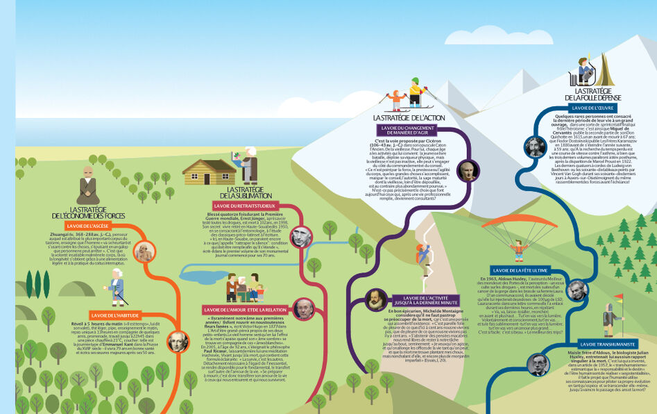 Si vieillir est inéluctable, les manières de vivre ce changement sont multiples. Deux grandes approches se dessinent face au vieillissement : il y a ceux qui cherchent la tranquillité du corps et de l’esprit, dans laquelle ils voient une sorte d’éternité accessible sur Terre, et ceux qui font le pari que la dépense d’énergie amène l’être humain à traverser l’épreuve du temps. Mais Alexandre Lacroix voit d’autres stratégies encore, comme celle de la « sublimation » ou celle de l’ « action ». Il en développe les avantages et les inconvénients dans cet article, en s’appuyant sur la vie de penseurs illustres : un parcours à retrouver sous forme de cartographie dans sa version imprimée, disponible chez votre marchand de journaux !