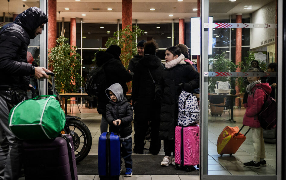 Des familles quittent un hôtel où elles étaient hébergées à Lyon, le 8 janvier 2024. Selon le collectif Jamais sans toit, la mise à l'abri des familles prend fin à cette date, alors qu'une vague de froid était annoncée sur l'ensemble de la France. © Jeff Pachoud/AFP